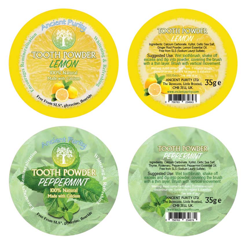 Re-Mineralising and Whitening these Tooth Powders effectively clean your teeth naturally. The positive whitening effect follows from consitent use... It works! curated with trusted teeth health ingredients that work harmoniously to give a feeling of freshness that lasts all day. Choose either the 100% Natural Lemon or Peppermint Blend with holistic ingredients and Essential Oils. The Tooth Powders really give your teeth a deep clean right to the tooth, the Re-mineralising (promoting the restoration of minerals, primarily calcium and phosphate, into the tooth enamel.) effects come with using only one of these Tooth Powders for a commited duration. Make sure you also have good Vitamin D levels, teeth are porous containing thousands of tiny pores just like your skin. It is through these pores that saliva nourishes the teeth. So chew food well for saliva, this helps to maintain a neutral pH and provides minerals to support enamel health. Keep you body hydrated in general and don't brush too much and a little of these goes a long way. Teeth are not simply pieces of enamel, each tooth is a vertebral organ with its own function. They are made of cells, so your wholefood diet will also play a part in their health. So switch over to a restoring, pH balancing, Tooth Powder that provides a fresh breath naturally. We designed this blend for ourselves, to use daily and they are FREE-FROM Fluoride, SLS and whatever other toxic stuff they put in toothpaste these days, who knows, lets move into a Healthy, Natural Future and let out a Big White Smile on the Journey. These are also Eco and stored in a Miron Glass Jar for maximum freshness and Enhancement.