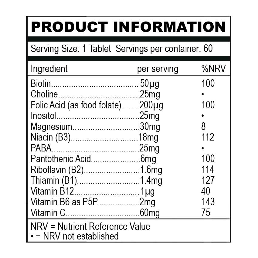 What makes this formula different is its food state delivery. Because these B vitamins are presented in a form the body recognises as food, they are absorbed efficiently and used immediately without overwhelming the system. Magnesium is included to support nerve signalling and muscular relaxation. Vitamin C contributes antioxidant protection. Choline supports liver function, lipid metabolism, and healthy brain chemistry. Every ingredient earns its place.
