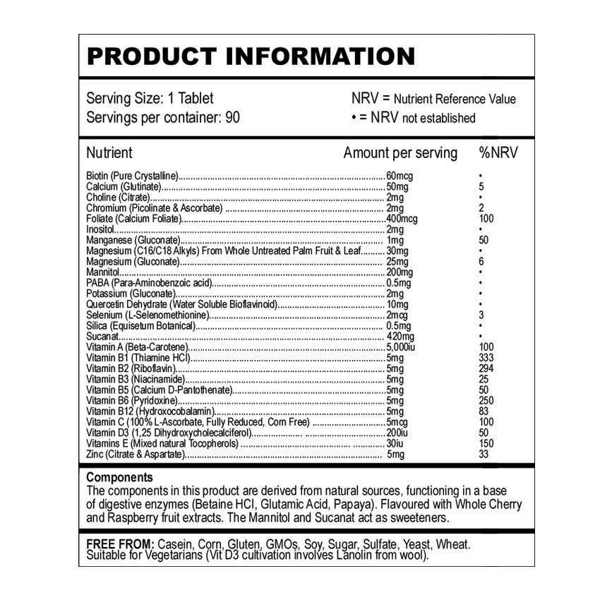 Components: The components are derived from natural sources, functioning in a baseof digestive enzymes (Betaine HCL, Glutamic Acid, Papaya) Flavoured with Whole Cherry and Raspberry fruit extracts. The Mannitol and Sucanat act as sweeteners. The Magnesium C16/18 is from whole untreated palm fruit and leaf.