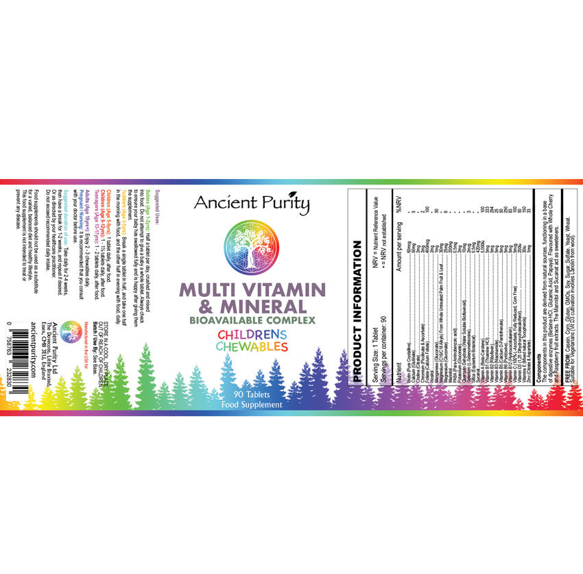 High-quality Children's Nutritional Multi solution. These nutrient-dense Chewable tablets are perfect for your kids, rich in vital nutrients Vitamins A‚ C‚ E, D, Potassium‚ Zinc‚ Selenium‚ and B-vitamins. Scientifically designed for full spectrum, absorbable, nutritional effect. These can be chewed by children or crushed into baby food. Boost your child's Immunity, Nutritional intake and support their healthy development. Contains Biotin, Calcium, Choline, Chromium, Folate, Inositol Manganese, Magnesium, Mannitol, PABA, Potassium, Quercetin, Selenium, Silica, Sucanat, Vitamins A, B1, B2, B3, B5, B6, B12, C, D3, E and Zinc. The components are derived from natural sources, functioning in a base of digestive enzymes (Betaine HCL, Glutamic Acid, Papaya) Flavoured with Whole Cherry and Raspberry fruit extracts. The Mannitol and Sucanat act as sweeteners. The Magnesium C16/18 is from whole untreated palm fruit and leaf. It's also completely Free From: Casein, Corn, Gluten, GMO's, Soy, Sugar, Sulfate, Yeast, Wheat, Citrus - Rose Hips or hesperidin (citrus)flavonoids, some children and adults have a sensitivity to this, and most Chewables contain them. Ancient Purity Children's Multi-Vitamins & Minerals Supplement is Food-Based "Bio-available" which means when your kid takes it the body will recognise and absorb it like food. Clean, Safe and Powerfully Effective for daily use (See Suggested Use for Age Guide). Stored in a Miron 'Dark Violet' Glass Jar for maximum freshness.