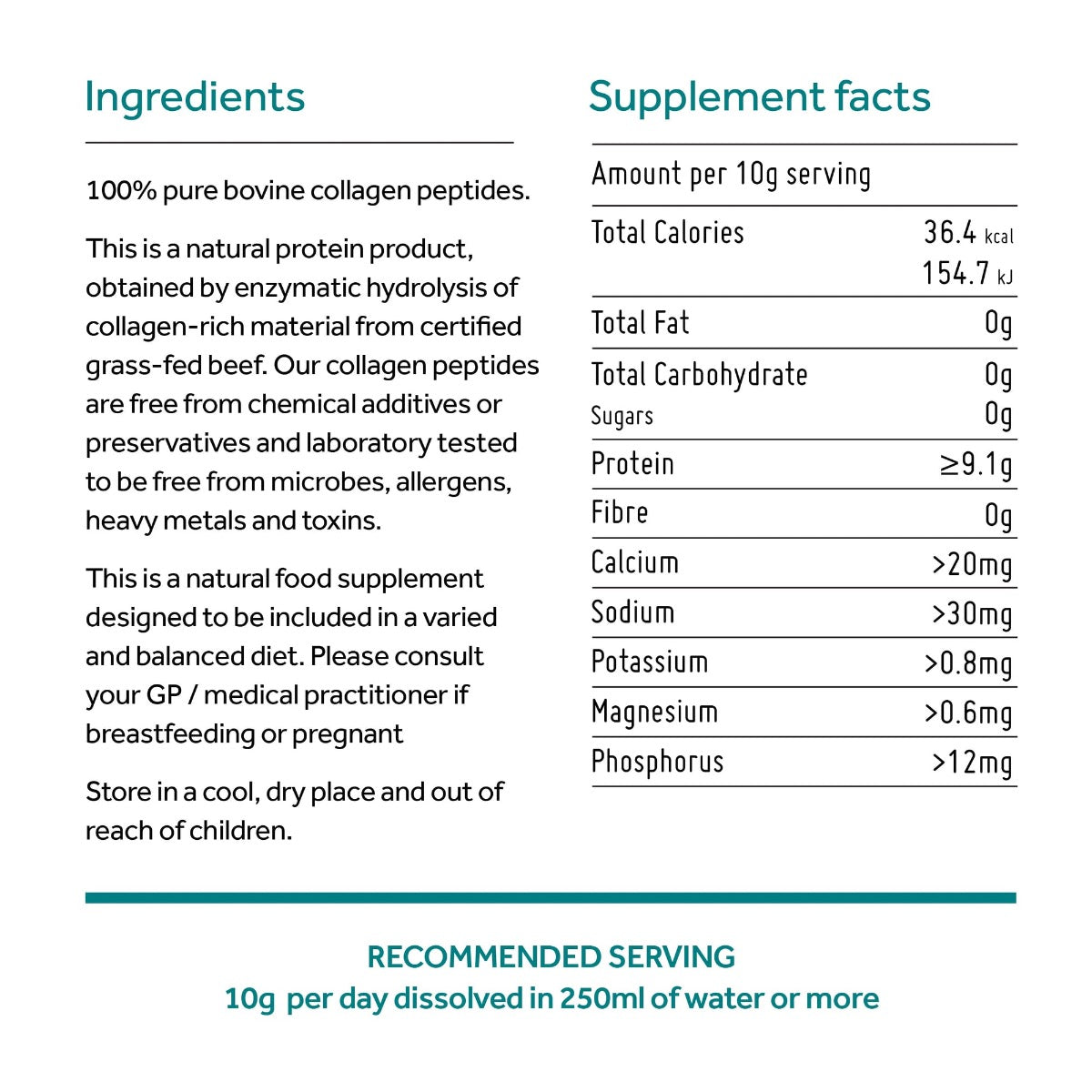 This 18.2% protein value Collagen is ethically sourced from pasture raised cattle, free to roam (grass, air, land and water). This Collagen is both Ketogenic and Paleo supportive, containing Proteins and Essential Amino Acids. It is absolutely Free From anything nasty. So this easy, daily use Collagen Powder is super clean, trusted, 100% neutral in flavour, odourless and completely water soluble. We believe that the path to wellness starts with the food that we consume! This can be added to Coffee, Tea, Smoothies or added to a Whey Protein Shake. You can also add it into Soups and Casseroles, it is safe to consume daily. Collagen is present in our muscles, bones, skin, blood vessels, digestive system and tendons. Collagen benefits are so striking because this protein is what helps give our skin strength and elasticity, along with replacing dead skin cells. Grass-Fed Collagen Peptides is rich in essential amino acids especially Glycine, L-Arginine, Glutamine and Proline. This truly is an all-natural supplement to support your wellbeing from strong, hair, nails and supple skin. Taking our high-quality Collagen provides an easy way to incorporate restorative proteins into your healthy daily routine. This is Pure, Hydrolysed, Collagen Protein.