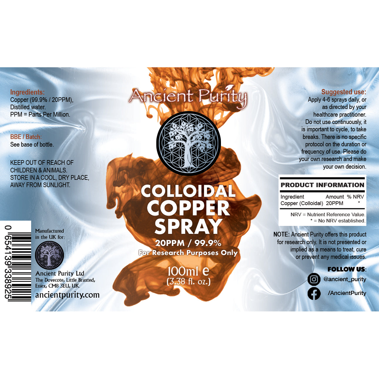 Manufactured using pharmaceutical-grade Copper with a purity of 99.998%. Copper ions in Colloidal Copper are believed to exhibit antibacterial properties, potentially aiding in combating infections. Copper is involved in iron metabolism, and its presence may support the proper absorption and utilisation of iron in the body. Some proponents suggest that CC may contribute to joint health and flexibility. It plays a role in vital cellular processes such as respiration, neural transmission, and tissue maturation. Copper is also a component of enzymes involved in collagen synthesis, and it is thought by some to promote skin health and wound healing. Topically applied colloidal copper has the potential to boost cell regeneration, rejuvenate the skin barrier, and combat free radicals generated by pollution, resulting in a more youthful complexion. It is commonly incorporated into various skincare products, including lotions, creams, and facial sprays. This is a charged particle Colloidal Copper made from 99.99% pure Elemental Copper and structured distilled water. Created with a constant high current process (electrolysis) this results in the smallest nano particle size, most effective and bioavailable.