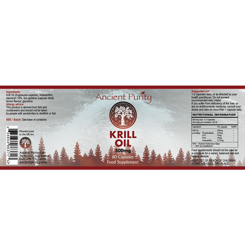 Sourced from Antarctic Krill, a small, shrimp-like crustacean that exists in large swarms. The oil from Krill boasts a source of eicosapentaenoic acid (EPA) and docosahexaenoic acid (DHA) which are types of potent Omega-3 Fats found solely in marine sources. They perform important functions in the body and are linked to a variety of health-improving properties. Antarctic Krill Oil contains naturally occurring Astaxanthin, which is one of the most powerful antioxidants! The EPA and DHA in this red Krill Oil are bound to phospholipids, research has suggested this is absorbed more efficiently in the gut than the omega-3 fatty acids in fish oils. Ancient Purity uses Rimfrost Antarctic Krill Oil which has Marine Stewardship Council (MSC) and Friend of the Sea certifications. This means proven commitment to maintaining the sustainability of Krill within the strict guidelines of CCAMLR (The Commission for the Conservation of Antarctic Marine Living Resources). The tiny Krill Fish are at the bottom of the food chain and collected far from pollution in the pristine seas surrounding Antarctica. 2 Softgels provide 1000mg of Red Krill Oil. Krill Oil is an intelligent approach to enhance your consumption of DHA, EPA and antioxidants such as Astaxanthin, while minimising your exposure to mercury, other hazardous metals and plastics that can disrupt hormones. This is Clean, Safe, Effective Krill Oil, stored in a Miron "Dark Violet" Glass Jar, which is for function, it improves and extends freshness.