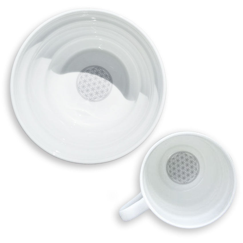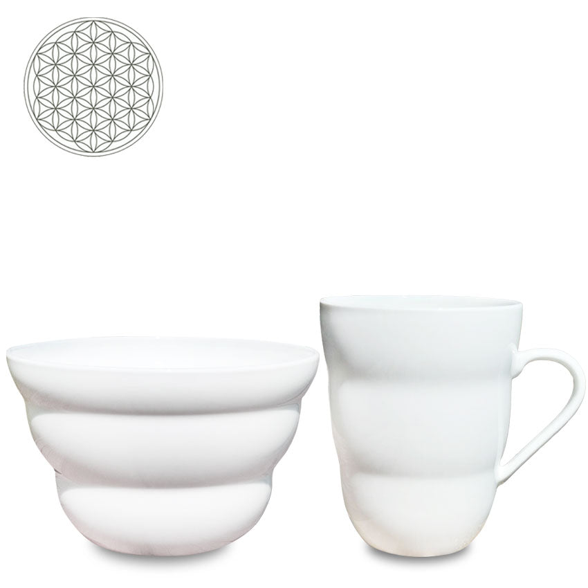 Sacred Geometry alive in an incredible Mug for Tea & Coffee, and a bowl, for fruits and other foods. Made from the Finest New Bone China Porcelain with a Silver Flower of Life. Designed in harmony with the sacred proportions of the Golden Ratio, this handcrafted piece is an instrument of energetic refinement, turning a simple cup of coffee, tea or tonic into a ceremony of coherence and presence. Every curve, every angle of these pieces are informed by nature’s supreme code: Phi, the Golden Ratio, the same mathematical harmony that governs galaxies, nautilus shells, pine cones and the unfurling of rose petals. When an object is created in alignment with this divine proportion, it does more than please the eye, it communicates a field of order and balance that resonates with the human body and energy field. The mug supports the energetics of what you consume, the mug has the potential to subtly influence the structure of the liquid it holds, and the bowl the foods placed in it. Just as sacred geometry is used to structure water for greater vitality and coherence, so too can the shape and proportion of your drinking vessel inform the molecular harmony of your beverage. Whether you’re sipping an organic coffee, ceremonial cacao, adaptogenic tea, or eating structured fruit from the bowl, the experience, not through fiction, but through form. Many in the holistic and bioenergetic fields believe that intention, frequency, and design all shape the vibrational quality of what we consume. Ideal for those on a conscious path, biohackers, herbalists, meditators, starseeds, and 5D-living seekers alike, this mug belongs in kitchens, temples, altars, studios, and sacred spaces where food, breath and thought are all treated with reverence. It’s not a gimmick. It’s a geometry. It’s an understanding that our tools can do more than function, they can transmit. Let your morning ritual become an act of alignment, I love my morning Cacao in the mug, and in summer blueberries are in the bowl.