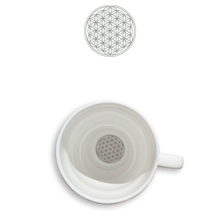 A: This mug is designed using the principles of sacred geometry, specifically the Golden Ratio and the Flower of Life, giving it not just beauty but also energetic resonance. It is both a functional object and a mindful ritual tool.