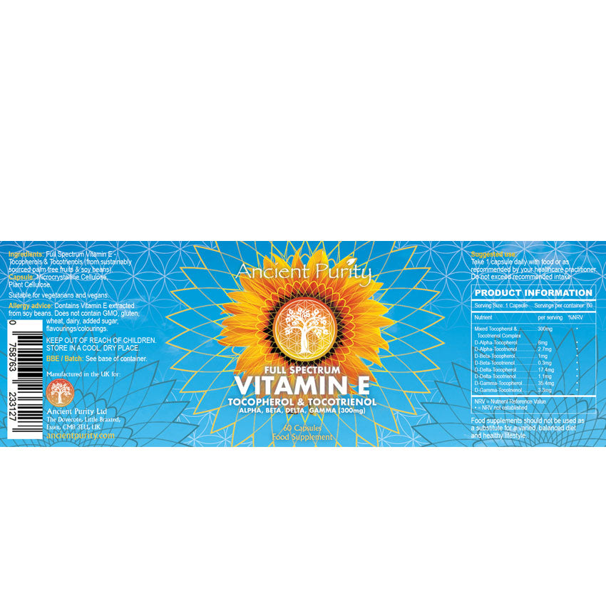 Full Spectrum Vitamin E (8 Components) Tocopherol & Tocotrienol Alpha, Beta, Delta, Gamma (the only way you should consider taking Vitamin E) This premier supplement was organically sourced from Palm Trees & Vegetables (vegan capsule). Vitamin E is mostly stored in our livers prior to being freed into our blood streams for use. Again another cutting-edge Ancient Purity Supplement going beyond just being "healthy"! This nutrient is essential to healthy vision, reproduction, and the health of your skin, blood and brain. It's food based and ultra-clean. Vitamin E protects your body from oxidative stress and offers antioxidant protection for the cells. Vitamin E levels decrease with age and UV light exposure from the sun can also reduce the levels of Vitamin E in the skin. Vitamin E is also important for athletes, this is because free radicals get released after training and the body may need more support and protection from them if you have a heavy training routine. We call it Full Spectrum each time because it's vital you know that most Vitamin E supplements are useless, you need the whole 8 together or you just won't get the result, this is not a "ours is best" studies have shown almost no effect at all from taking typcial Vitamin E Supplements, most are devoid of whats needed, even the better ones fail because only alpha-tocopherol is present, it must include the other tocopherols and tocotrieno. Ancient Purity Vitamin E - Full Spectrum is Food-Based "Bio-available" which means when you take it your body will recognise and absorb it like food, we are about getting the best, the right supplements at the right amount, this is what we've done here with Vitamin E. Stored in a Miron Glass.